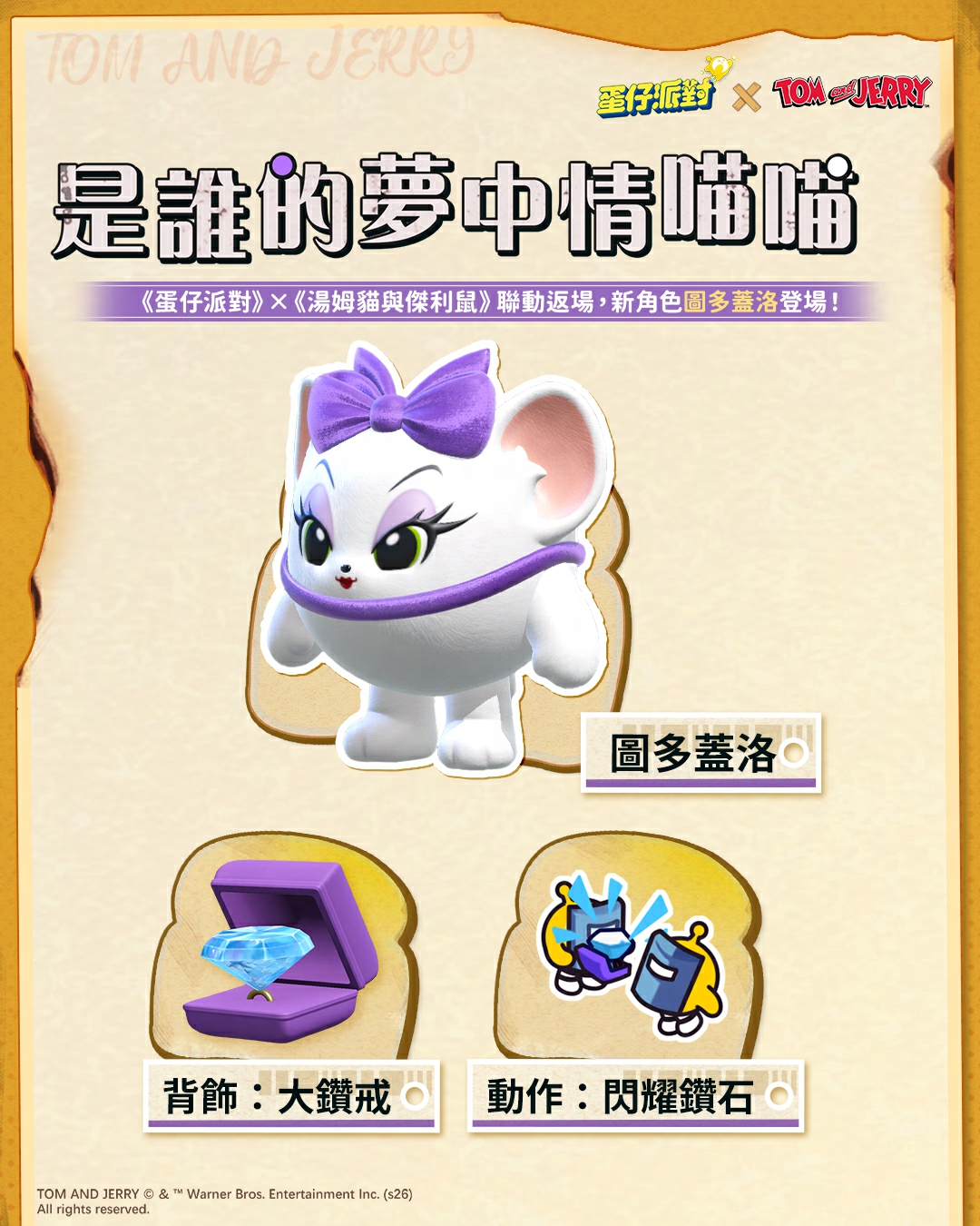 老朋友重聚,新朋友登場!由華納兄弟互動娛樂(WBIE)授權,高人氣派對遊戲《蛋仔派對》×《湯姆貓與傑利鼠》聯動於3月20日驚喜返場!本次除了湯姆貓、傑利鼠等人氣角色限時回歸,更有一位備受矚目的“新朋友”——優雅迷人的圖多蓋洛將首次亮相蛋仔島!