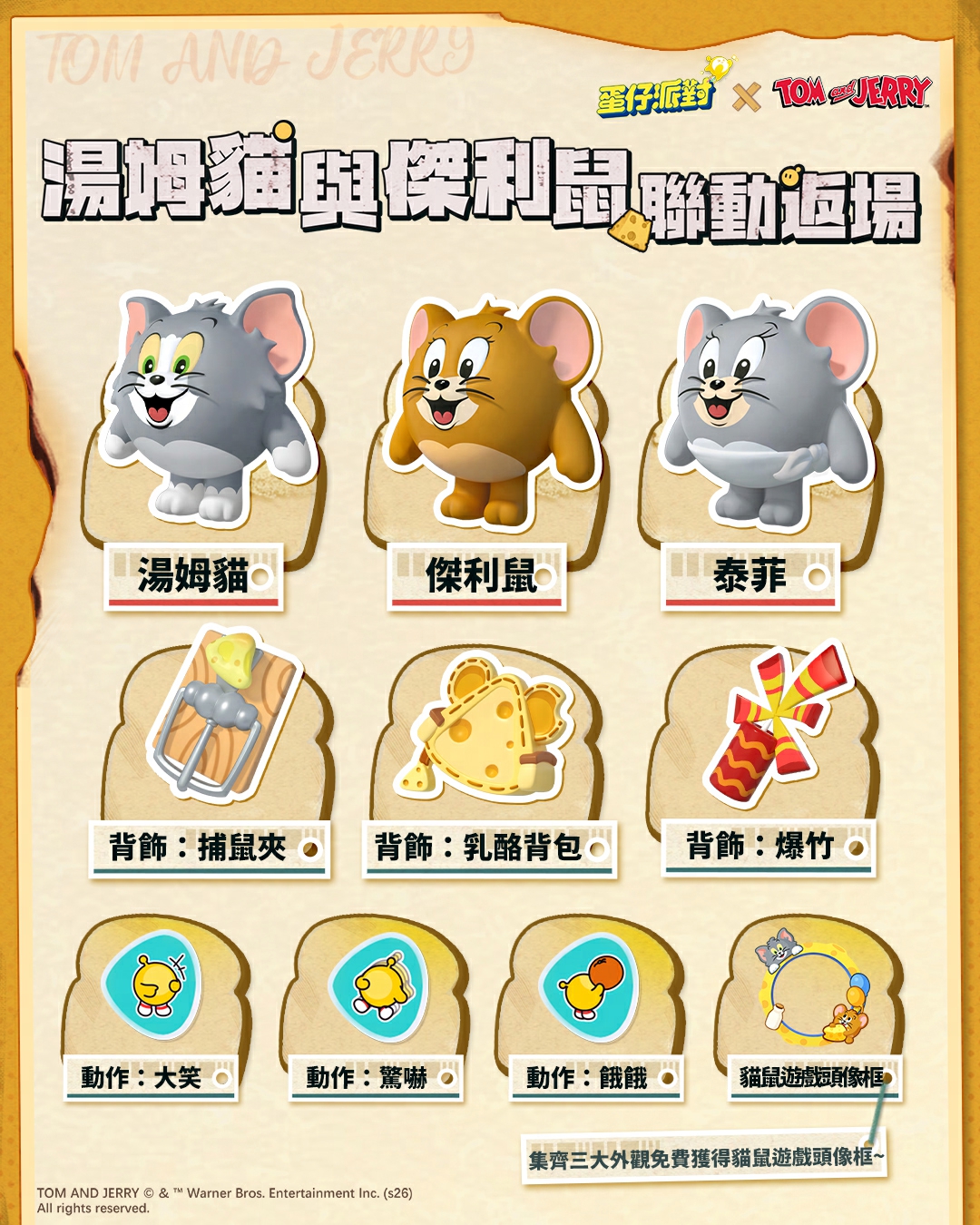 三大經典角色復刻,「湯姆貓」、「傑利鼠」、「泰菲」再次集結!「捕鼠夾」、「奶酪背包」、「爆竹」等人氣配件返場,還有經典動作、頭像框等你拿下!
